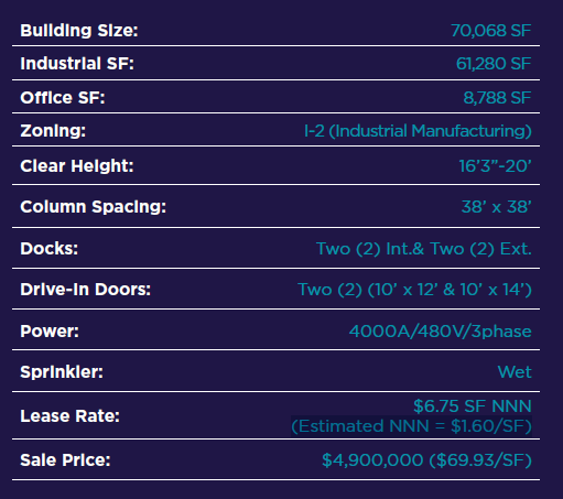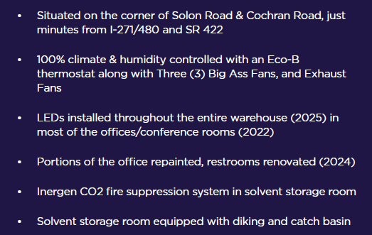 29601 SOLON ROAD Industrial Feb 18 Written By Barna Caplan BROCHURE FLOORPLAN FOR SALE - $4,900,000 ($69.93/SF) OR LEASE - $6.75 SF NNN (Estimated NNN = $1.60/SF) For LeaseFor Sale50K SF - 100K SF Barna Caplan